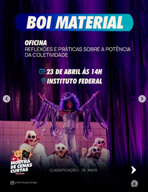 A abertura da mostra, no dia 23, aciona um dos eixos centrais desta edição: o teatro como prática coletiva. A companhia Cênica conduz a oficina “Boi Material: Reflexões e práticas sobre a potência da coletividade”, às 14h, no anfiteatro do IFSP, com classificação etária de 16 anos.