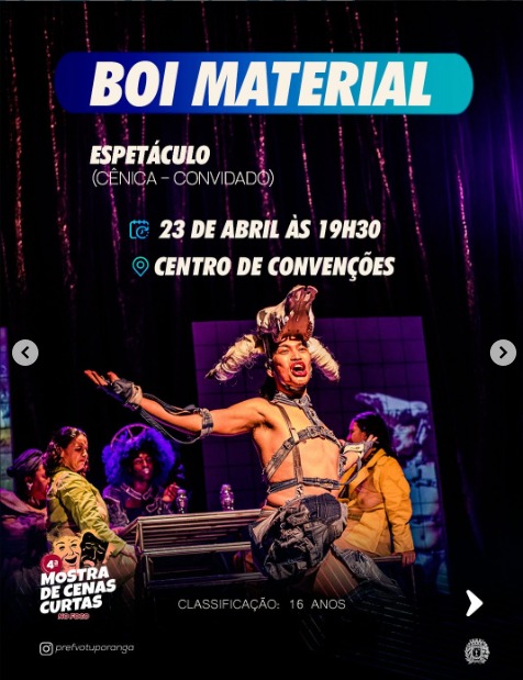Já à noite, às 19h30, a apresentação especial convidada “Boi Material” acontece no Centro de Convenções. O espetáculo se passa em uma feira de exposição, onde um grupo de artistas contratado para entreter o público passa a se reconhecer como parte de uma engrenagem de poder que impacta diretamente as existências do planeta. Em meio ao leilão de gado — que evoca a iconografia do boi na pintura brasileira —, a cena propõe uma subversão desse jogo, alternando papéis e tensionando relações de domínio e resistência.
