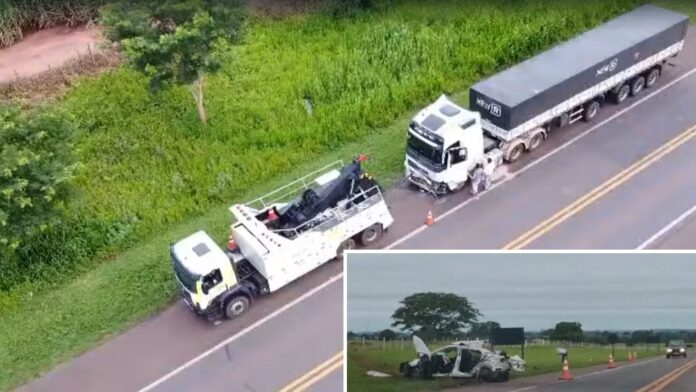 Segundo a Polícia Rodoviária, um carro bateu na traseira de outro automóvel ao tentar uma ultrapassagem. Na sequência, esse mesmo carro derrapou sobre a pista, invadiu a pista contrária e atingiu o caminhão que seguia no sentido oposto.