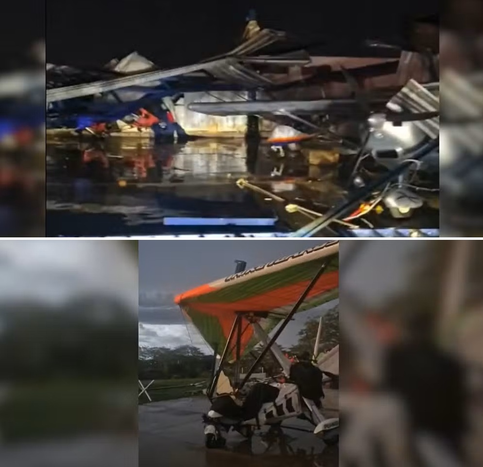 A chuva forte acompanhada de ventos e granizo causou a queda dos telhados de dois hangares no Aeroclube de Ibirá/SP, na noite desta quarta-feira (14.jan). Os aviões ficaram danificados.