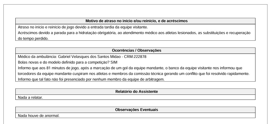 Mesmo assim, o relato pode ser analisado pelas autoridades competentes e gerar desdobramentos disciplinares após a partida.