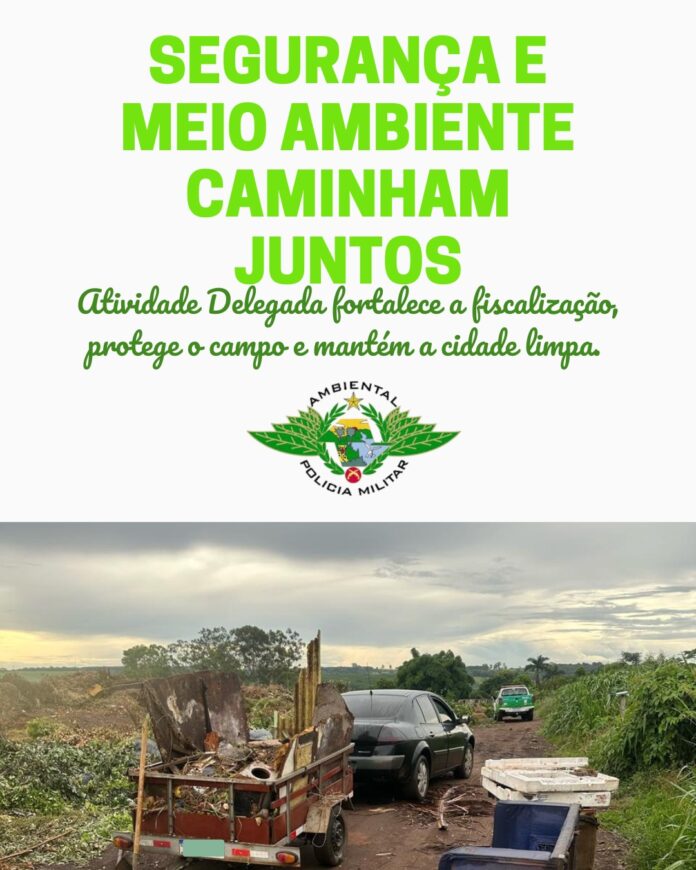 Durante fiscalização realizada no âmbito da Atividade Delegada, a equipe do Policiamento Ambiental flagrou uma tentativa de descarte irregular de resíduos sólidos em local destinado exclusivamente ao depósito de podas de árvores. No local, foi identificado um veículo com carretinha carregada com móveis domésticos, entulho de construção, isopor e outros materiais, que seriam descartados de forma inadequada.