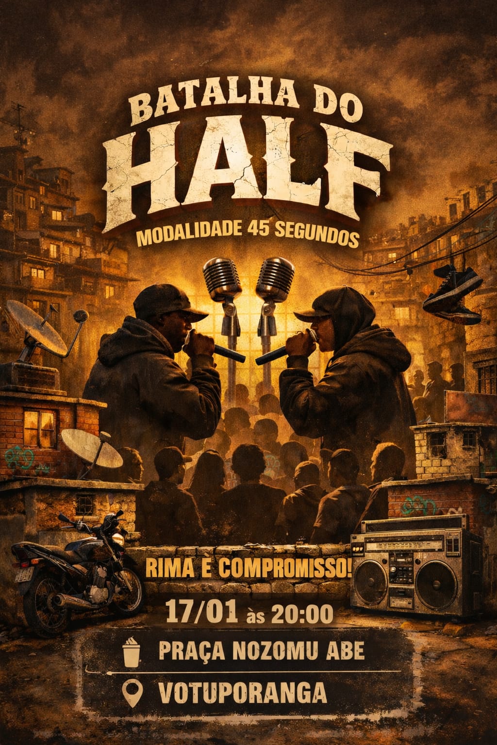 Desde 2017, a Batalha do Half ocupa o espaço público como território de expressão artística, diálogo social e fortalecimento da cultura hip-hop em Votuporanga. Para além de uma disputa de rimas improvisadas, o evento se consolidou como ponto de encontro da juventude periférica, promovendo lazer, pertencimento e visibilidade para vozes historicamente marginalizadas.