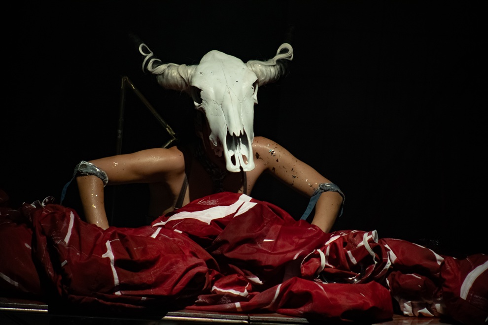 A dramaturgia, não linear, é construída a partir de imagens, ações físicas e camadas simbólicas que articulam o boi como figura dual: ao mesmo tempo associado a uma lógica patriarcal, exploratória e autoritária, e a uma potência coletiva presente na cultura popular e nas formas de resistência.