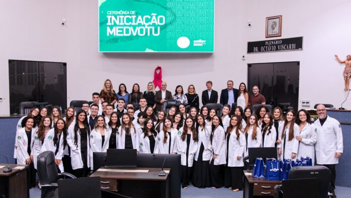 A Unifev realizou, no último sábado (18.out), a Cerimônia do Jaleco da 14ª turma do curso de Medicina, no plenário da Câmara Municipal. O evento reuniu alunos ingressantes, familiares, docentes e autoridades acadêmicas para celebrar o início da jornada universitária dos futuros médicos.