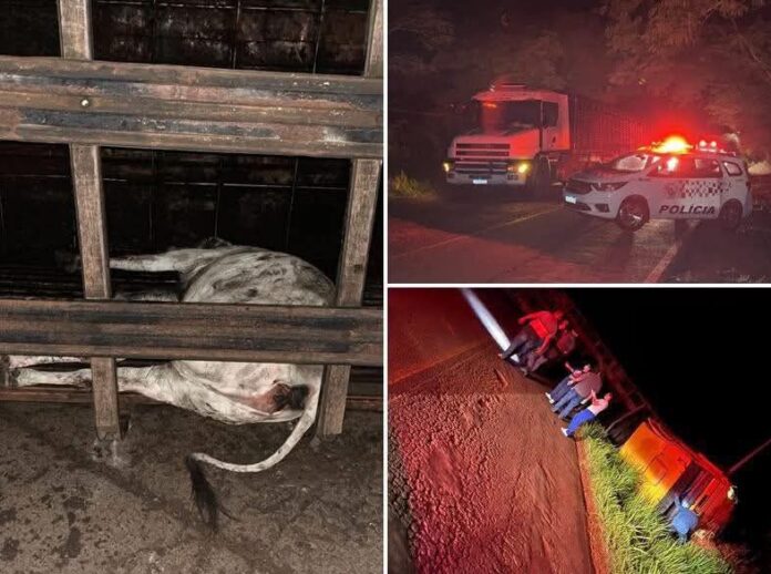 De acordo com o apurado, o veículo seguia carregado com bovinos, quando por motivos ainda desconhecidos, o condutor perdeu o controle da direção e o caminhão acabou tombando às margens da pista. Com a violência do impacto um boi morreu no local e outros animais ficaram soltos correndo assustados em direção a uma área de pasto ao lado da rodovia.