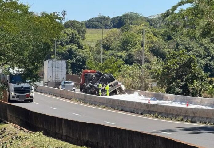 Segundo a Polícia Rodoviária, o motorista contou que perdeu o controle depois que os pneus do veículo estouraram. A ureia, usada para adubo, ficou espalhada pela via, causando risco de contaminação à água de uma represa próxima do local.