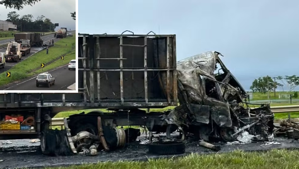 Um motorista foi socorrido com queimaduras após um caminhão bater na traseira de outro e pegar fogo na Rodovia Euclides da Cunha (SP-320), no km 588, próximo à Estrada da Uva, em Jales/SP, na manhã desta quarta-feira (25.fev).