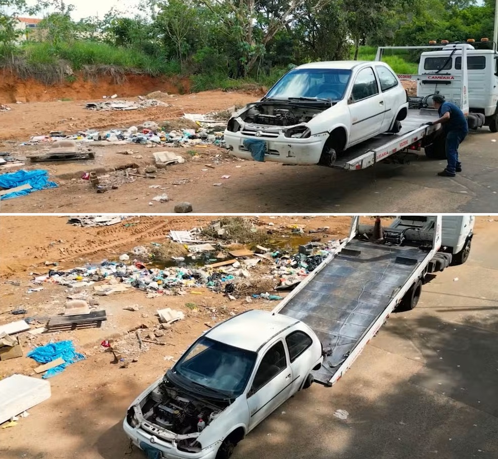 Em consulta, foi constatado que o carro tinha débitos de multas que somam cerca de R$ 580 e o último licenciamento foi efetuado em 2024. Além do veículo, restos de móveis, galhos e embalagens foram encontrados no local nesta quinta-feira.