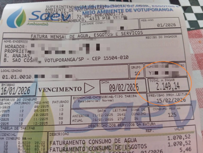 O valor na fatura da conta de água dos votuporanguenses de janeiro de 2026 tem gerado revolta nas redes sociais e monopolizado o discurso, em alguns casos, o preço cobrado dobrou, quando comparado a faturas anteriores.