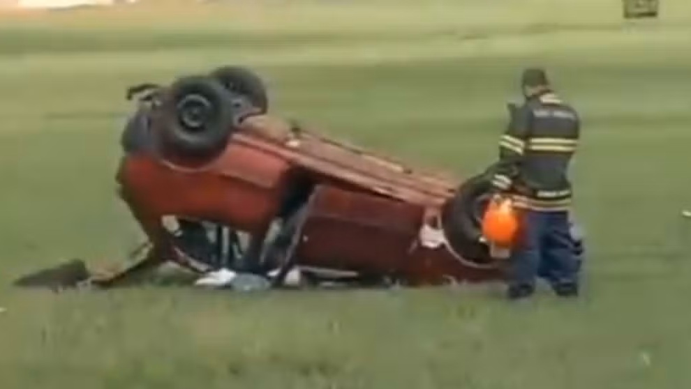 Capotamento ocorreu neste domingo (9), na Estrada Vicinal Valdomiro Campanhola. Havia cinco pessoas no carro, sendo três adultos e duas crianças.