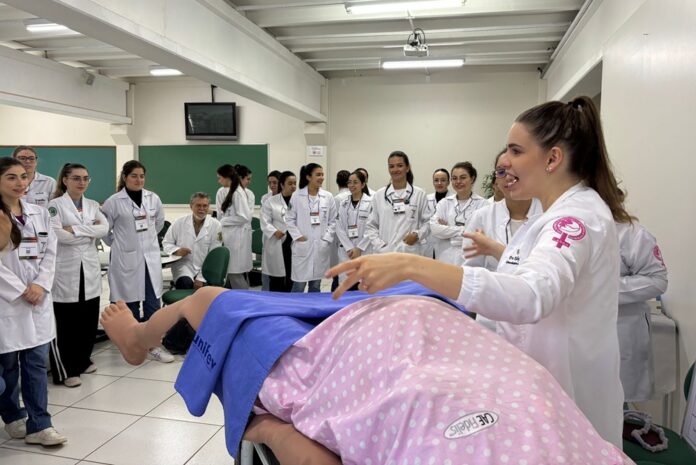 Com o tema “Parto normal e recepção do recém-nascido”, o encontro contou com a participação de médicos especialistas e foi dividido em dois momentos: uma introdução teórica sobre os principais aspectos do parto e dos cuidados neonatais com a professora Kally, e uma atividade prática com manequins de simulação realística, que permitiu aos discentes vivenciar, de forma dinâmica, situações reais da rotina médica, com o pediatra e docente do curso de Medicina, Prof. Esp. Carlos Alberto Tellis.