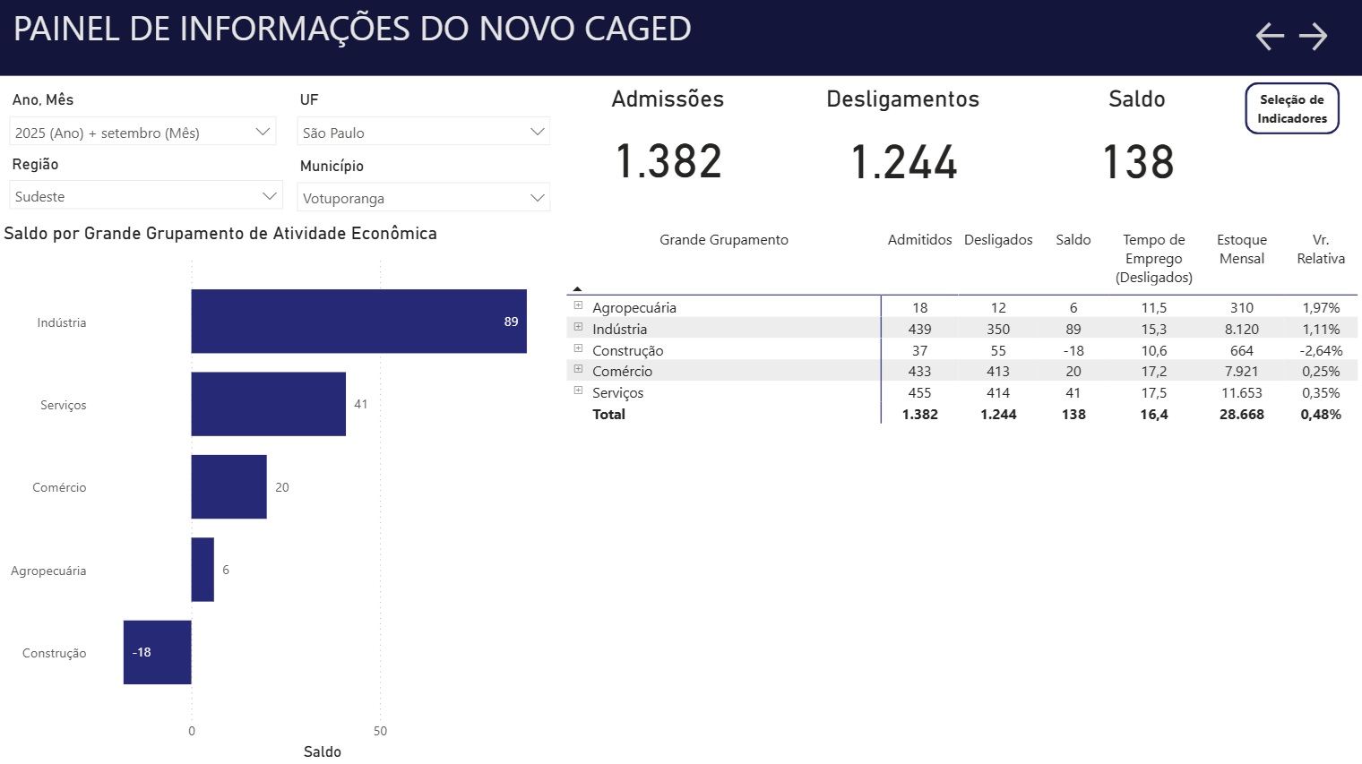 Em Votuporanga/SP, os mesmos dados apontam a abertura de 138 vagas, fruto da dinâmica entre 1.382 contratações e 1.244 demissões. O resultado para o período mantém o município no ‘azul’, já que em agosto registrou a abertura de 130 vagas.