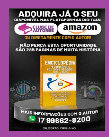 *Gilberto Cipriano: formado em Administrador de Empresas, História e Complementação Pedagógica, comentarista esportivo da TV Canal Dez e autor dos livros: Alma Águia – 61 Anos da Águia, Almanaque do Campeonato Brasileiro de Seleções Estaduais e Enciclopédia Fernandópolis nos Jogos Regionais 1970-2025.