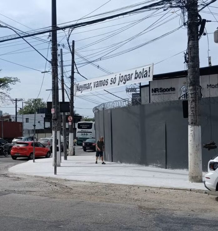 Uma faixa com cobranças a Neymar foi pendurada nesta quinta-feira em frente ao CT Rei Pelé, onde a equipe profissional do Santos treina diariamente.