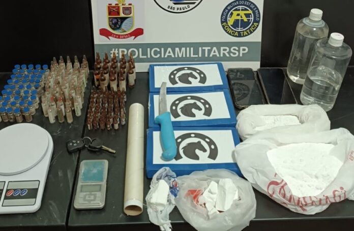 Em seguida, os policiais militares realizaram buscas na residência do suspeito, onde foram apreendidas pedras não fracionadas de cocaína, diversos apetrechos para preparo da droga, dois frascos de acetona, duas balanças de precisão, uma faca com resquícios de cocaína e dezenas de ampolas com substâncias químicas, incluindo morfina, cloridrato de dopamina, dexmedetomidina e fenitoína, que segundo a polícia, são utilizadas para aplicação intravenosa por usuários de drogas.