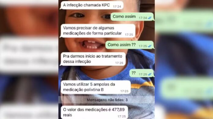 “Foi constatada uma infecção, chamada KPC. Vamos precisar de algumas medicações de forma particular para dar início ao tratamento dessa infecção. Vamos utilizar cinco ampolas da medicação polixtina B. O valor da medicação é 477,89 reais”, escreveu o falso médico.
