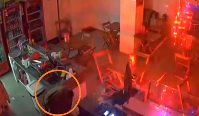 O suspeito foi flagrado por uma câmera de segurança no momento em que invadiu o comércio.