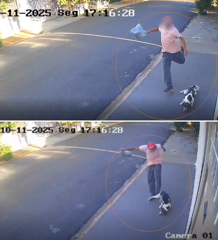 Um homem foi flagrado chutando uma cachorra na tarde de segunda-feira (10.nov), em Olímpia/SP. Uma câmera de segurança registrou o momento em que o suspeito se aproxima do animal e o agride. Além do chute, o homem golpeia a cachorra com uma sacola.