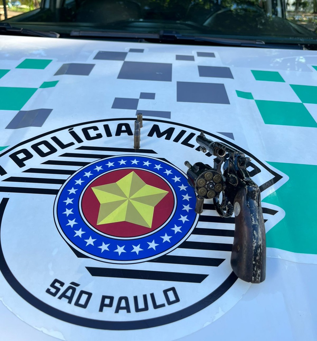 Já na busca veicular, os PMs encontraram no interior de uma bolsa preta, sob o banco traseiro, um revólver calibre .32, carregado com seis munições intactas. A arma, de cor preta, encontrava-se sem marca e numeração aparentes, uma vez que estava pintada com tinta preta espessa, dificultando a identificação, que só será confirmada por meio de exame pericial. Ainda no interior da bolsa, foram localizadas mais cinco munições intactas.