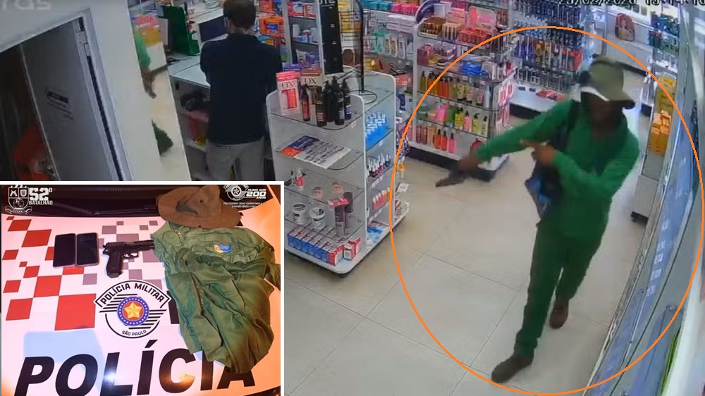 Imagens de câmera de segurança mostram o momento em que o suspeito entra no local, vestindo um uniforme verde e chapéu na cabeça. Inicialmente, ele finge ser um cliente e vai até o caixa, antes de anunciar o assalto.