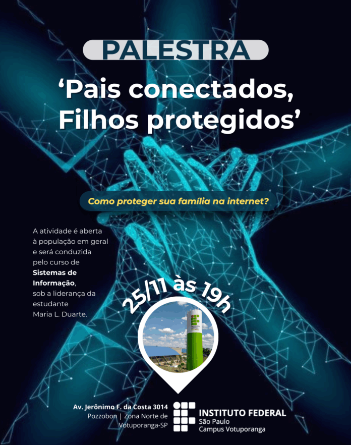 Nesta terça (25.nov), às 19h, o IFSP Votuporanga oferece a palestra “Pais conectados, filhos protegidos”, voltada às famílias preocupadas com a navegação de seus filhos em computadores e celulares. O objeto é aproximar os adultos da realidade online de crianças e adolescentes, contribuindo para uma convivência digital mais segura. A palestra acontecerá no Anfiteatro da unidade.