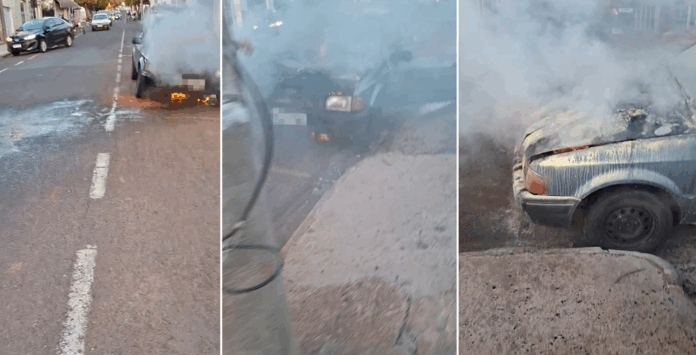 O fogo começou no motor do veículo Ford/Scort e foi controlado por populares; ninguém ficou ferido.