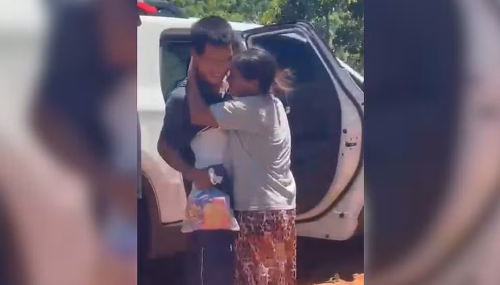 Um vídeo enviado à reportagem mostra o momento em que o jovem desce de uma caminhonete e abraça a mãe e outros familiares. O reencontro foi marcado por emoção.