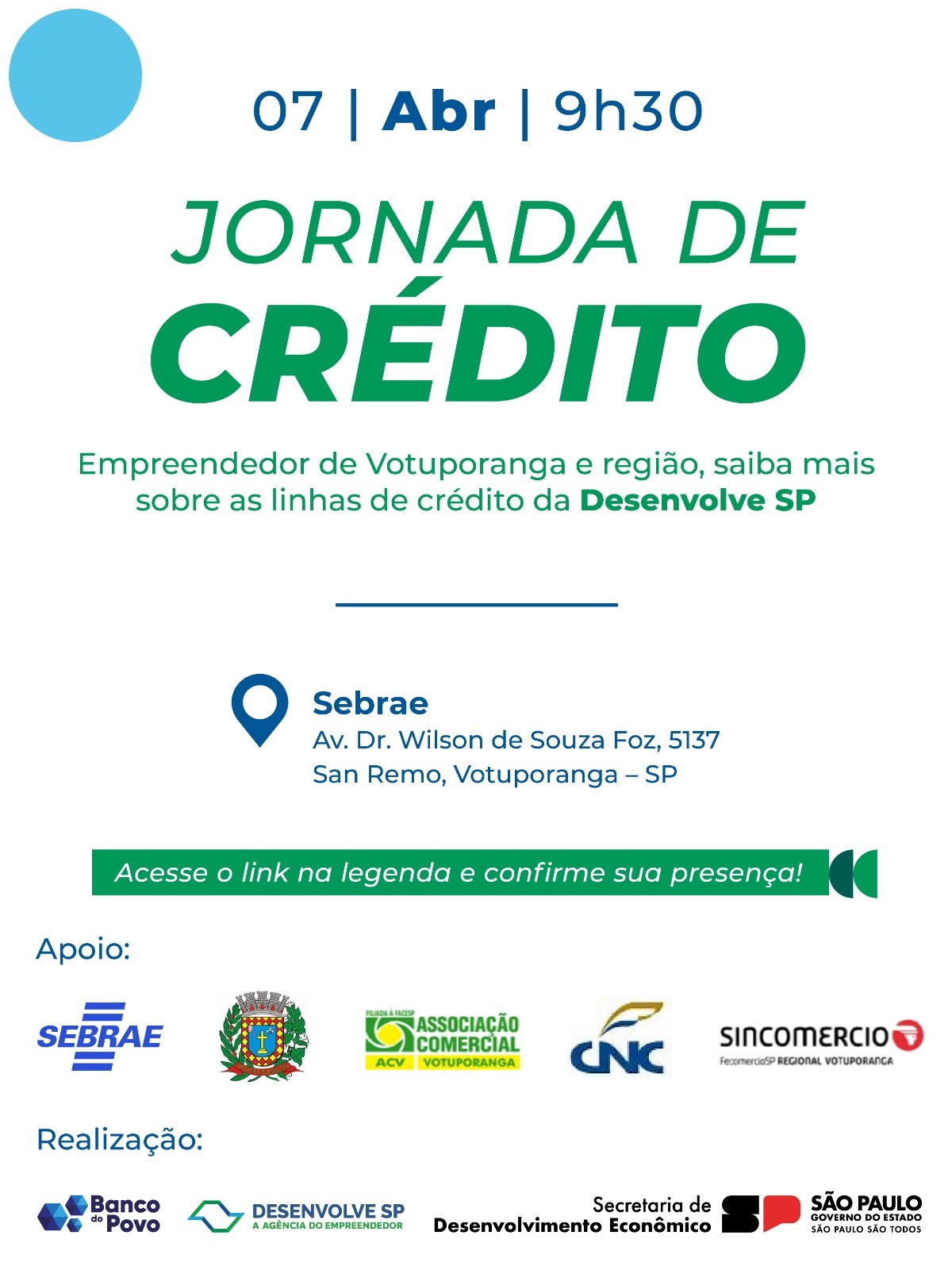 Empreendedores de Votuporanga terão a oportunidade de conhecer, na próxima terça-feira (7.abr), as principais linhas de financiamento disponíveis para pequenos negócios durante a Jornada de Crédito promovida pela Desenvolve SP. O encontro será realizado às 9h30, na sede do Sebrae-SP no município.