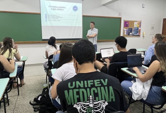 A graduação em Medicina da Unifev realizou, na tarde da última segunda-feira (6.out), a aula inaugural do curso de extensão “Inglês Médico”, ministrado pelo Prof. Dr. Ernesto Hoffmann. Com um total de sete aulas, a capacitação está sendo realizada no Câmpus Centro, das 17h às 18h, com encerramento previsto para o dia primeiro de dezembro.