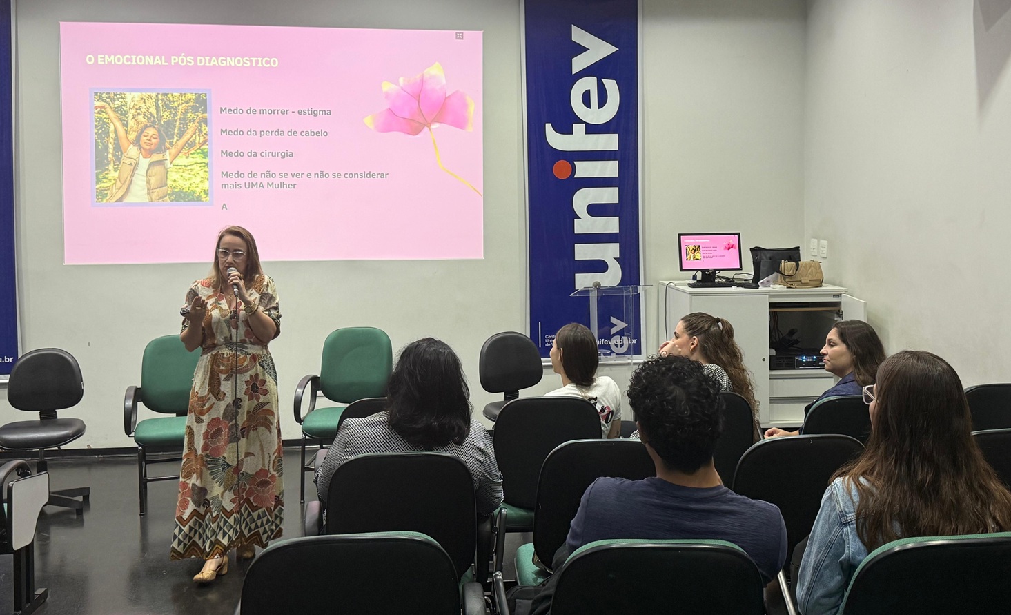 A Unifev realizou, na última quarta-feira (29), a mesa-redonda “Outubro Rosa”, reunindo alunos dos cursos da área da Saúde no Auditório Prof. Antônio Seba, no câmpus Centro. O evento teve como objetivo promover conhecimento e conscientização sobre o câncer de mama, abordando diferentes perspectivas de cuidado e atuação profissional.