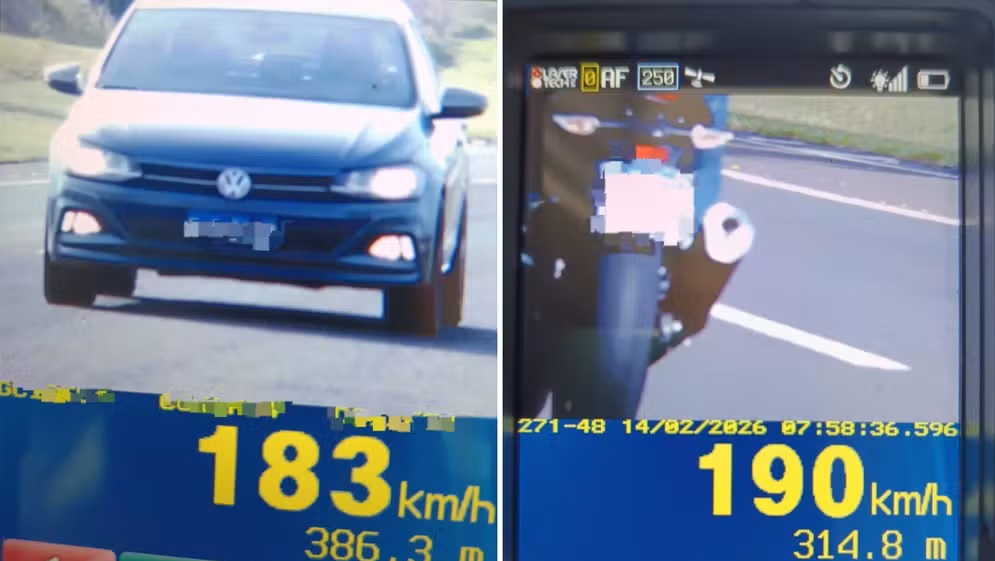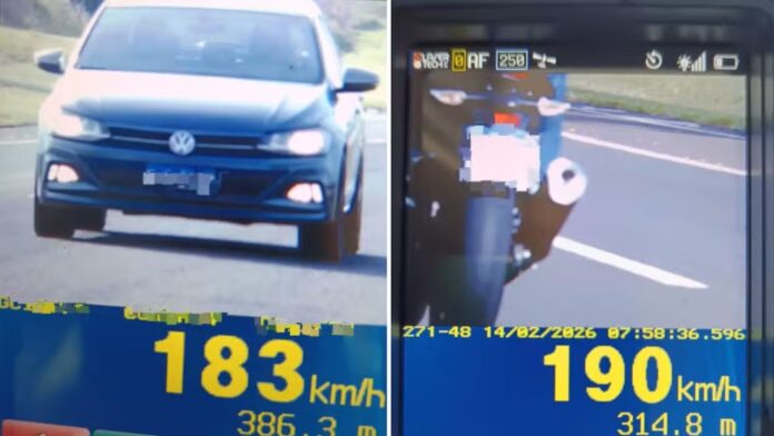 Um motociclista e o motorista de um carro foram flagrados dirigindo a quase 200 km/h na Rodovia Marechal Rondon (SP-300), em Penápolis/SP, no último sábado (14.fev). A velocidade permitida para a via é de 110 km/h para os veículos.