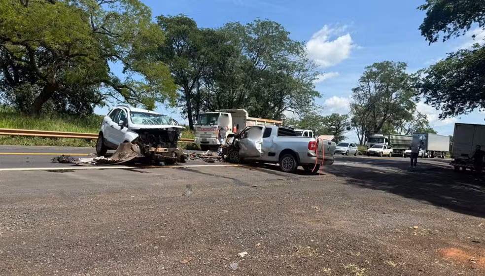 Um motorista de um carro bateu de frente contra uma caminhonete na Rodovia Transbrasiliana (BR-153) na manhã desta quinta-feira (11.dez), em Onda Verde/SP. O acidente causou a interdição total da pista, nos dois sentidos.
