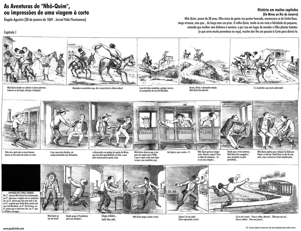 Já no Brasil, o ponto de partida é ainda anterior: em 30 de janeiro de 1869, o desenhista ítalo-brasileiro Angelo Agostini cria “As Aventuras de Nhô Quim ou Impressões de Uma Viagem à Corte,” para o jornal Vida Fluminense. A escolha da data que celebra o Dia Nacional das Histórias em Quadrinhos está diretamente ligada a esse marco fundador da produção nacional.