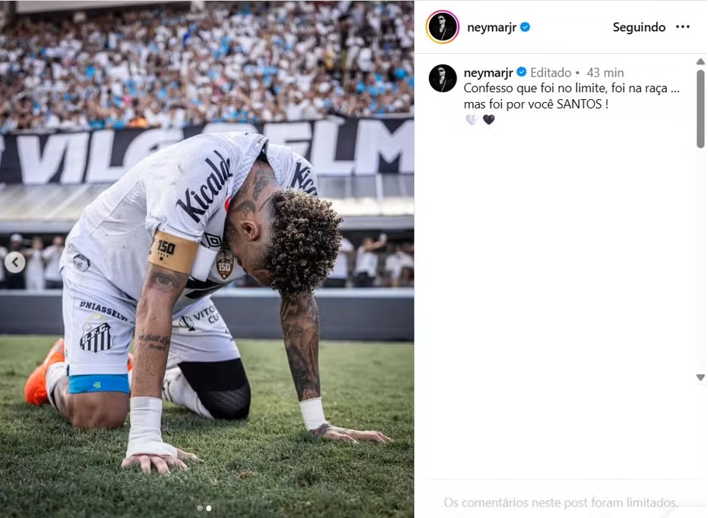 O camisa 10 do Peixe jogou as últimas três partidas da temporada com uma lesão no menisco do joelho esquerdo e, agora, passará por uma cirurgia. Em seu perfil no Instagram, Neymar reuniu fotos do alívio após a vitória por 3 a 0 sobre o Cruzeiro, que garantiu o Santos na Série A de 2026, e escreveu: “Confesso que foi no limite, foi na raça… Mas foi por você, SANTOS”, disse o craque.