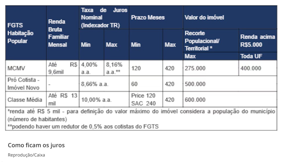 “Na prática, famílias com renda em torno de R$ 3.000, que anteriormente estavam enquadradas na Faixa 2, passam a acessar as condições da Faixa 1, beneficiando-se da redução da taxa mínima de juros”, afirma a Caixa, em nota.