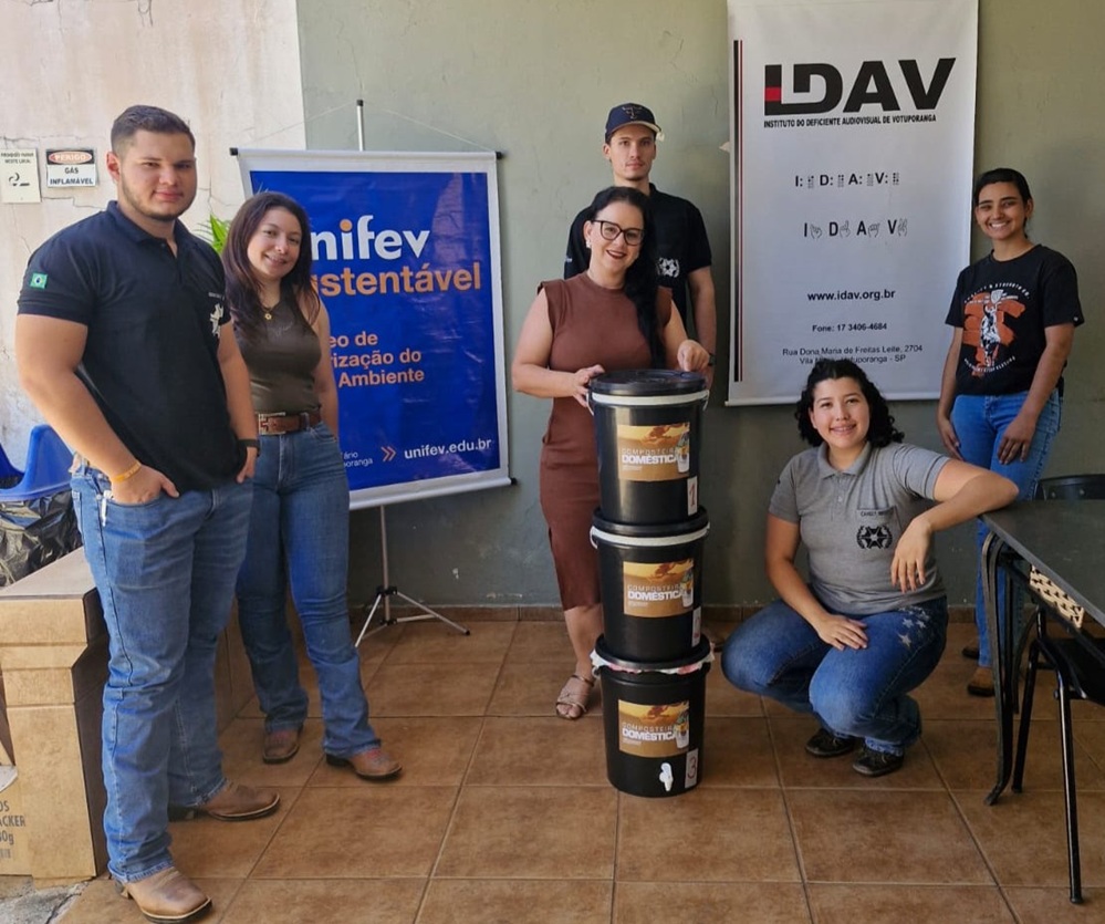 Como parte de um projeto de sustentabilidade da Unifev, o Núcleo de Valorização do Meio Ambiente (NVMA), em parceria com estudantes do curso de Agronomia, repassou ao Instituto do Deficiente Audiovisual de Votuporanga (IDAV) no último sábado (27.set) três composteiras domésticas. Os materiais foram confeccionados a partir de baldes reutilizados.