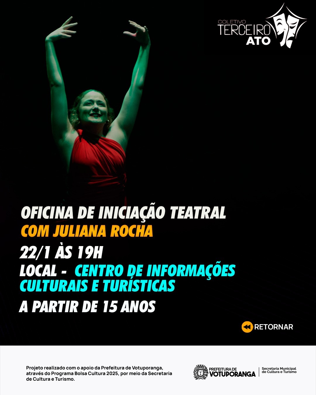 As oficinas contam com apoio da Prefeitura de Votuporanga, por meio do Programa Bolsa Cultura 2025, da Secretaria de Cultura e Turismo. A participação é gratuita, e as inscrições podem ser feitas pelo link disponível na bio de perfil do Instagram @terceiroato.coletivo.