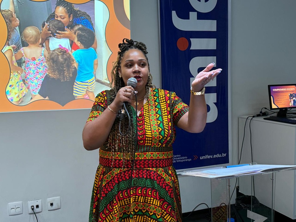 Para encerrar a noite, a professora da Educação Básica Luana Lucindo tratou de uma questão para o desenvolvimento das crianças em sala, a construção positiva da autoestima e da identidade negra.