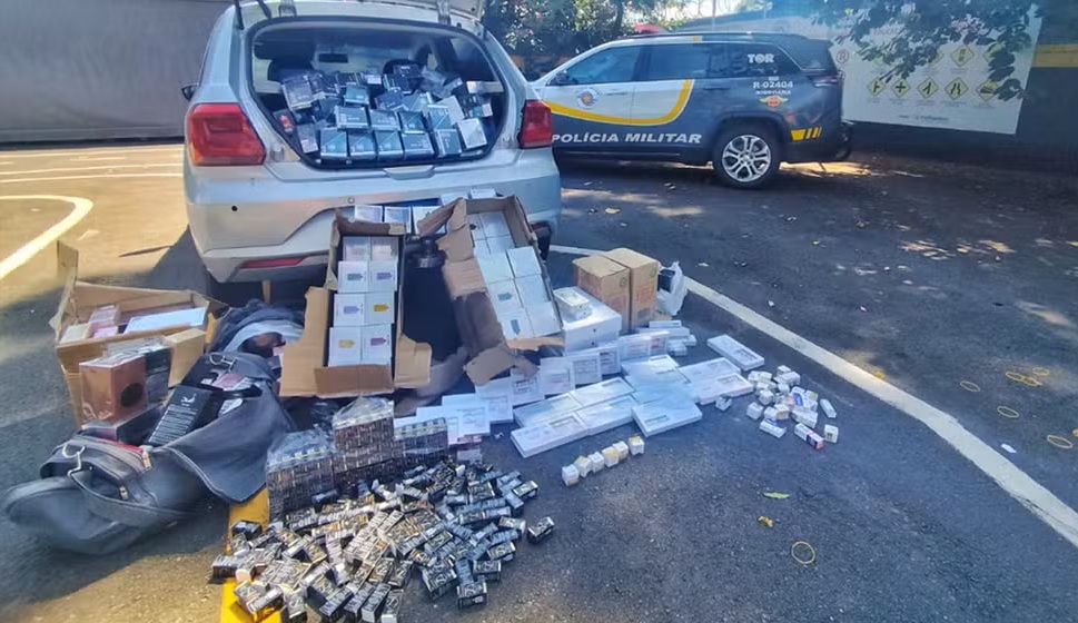 A Polícia Rodoviária apreendeu quase R$ 1,4 milhão em produtos contrabandeados, entre eles cigarros eletrônicos, tirzepatida e anabolizantes, transportados em um carro, na rodovia Assis Chateaubriand (SP-425), em Santópolis do Aguapeí/SP, na manhã deste domingo (12.abr).