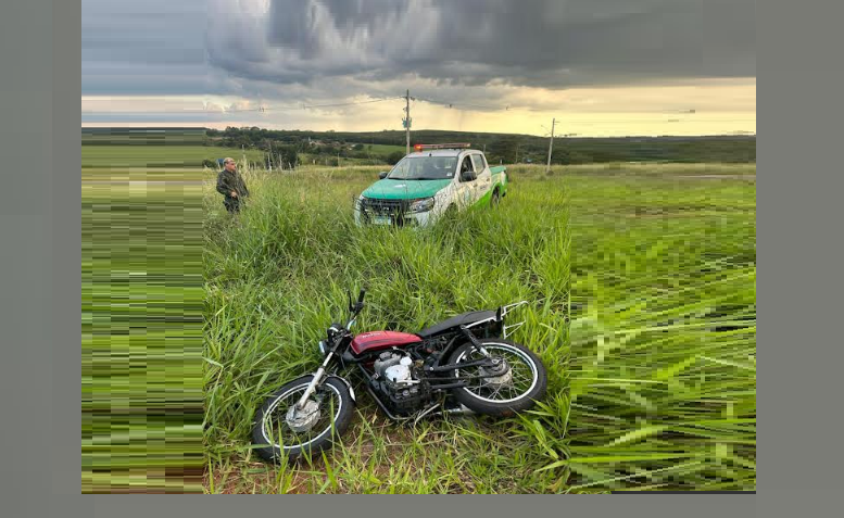 Durante a fuga, o condutor perdeu o controle da motocicleta em um terreno, abandonando o veículo e tentando evadir-se a pé. Em vistoria na motocicleta, constatou-se adulteração nos sinais identificadores de chassi e motor, além da ausência de emplacamento, verificando-se ainda que o motor pertencia a outro modelo de motocicleta.