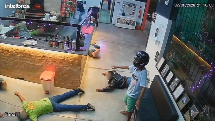 Imagens de câmeras de segurança mostram dois homens chegando em uma motocicleta. Um dos suspeitos aparece com uma arma.