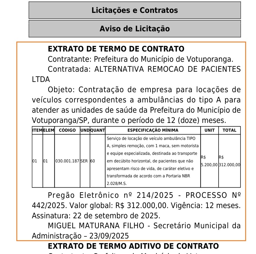A Prefeitura de Votuporanga/SP divulgou no Diário Oficial do Município da última quarta-feira (24.set) a contratação de ambulâncias para efetuar serviços de remoção simples por R$ 312 mil por 12 meses. Segundo apurado, apesar de não constar no edital ou no contrato, trata-se de cinco veículos ao custo de R$ 5,2 mil cada por mês. A empresa vencedora do pregão eletrônico é de Araraquara/SP e já prestava serviço no município desde 2022. O contrato tem o prazo de um ano, prorrogável por até mais 10.