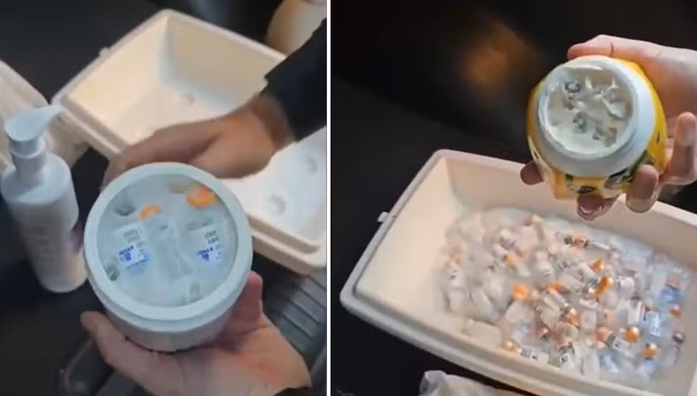 No interior do carro, os agentes localizaram uma caixa térmica com 91 ampolas de substâncias análogas à tirzepatida, de origem paraguaia e comercializada de forma ilegal no Brasil.