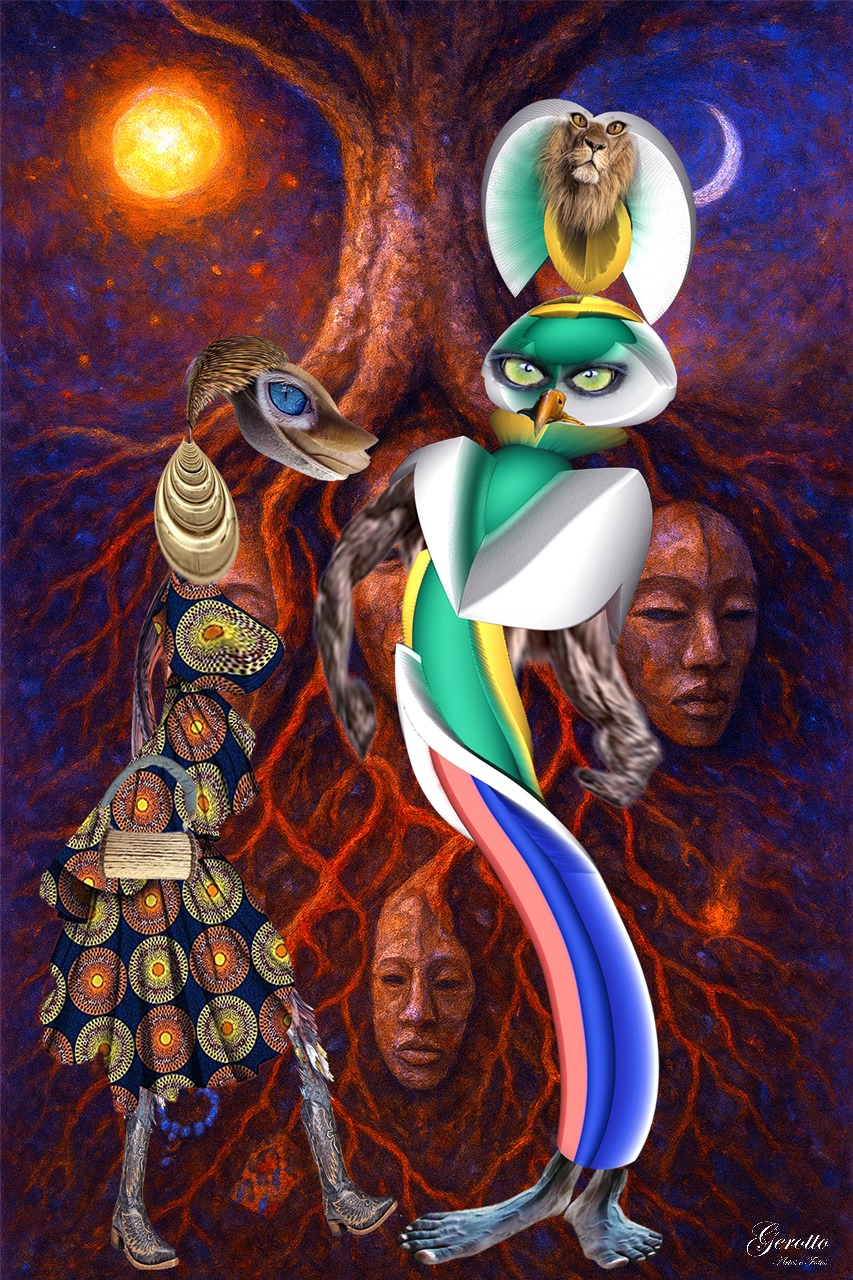 Entre os trabalhos expostos, o artista Gerotto comenta sobre sua obra “Raízes que Andam, Ancestrais que se Olham”, na qual a descreve como “um encontro entre figurações totêmicas e elementos da cultura afrodescendente”.