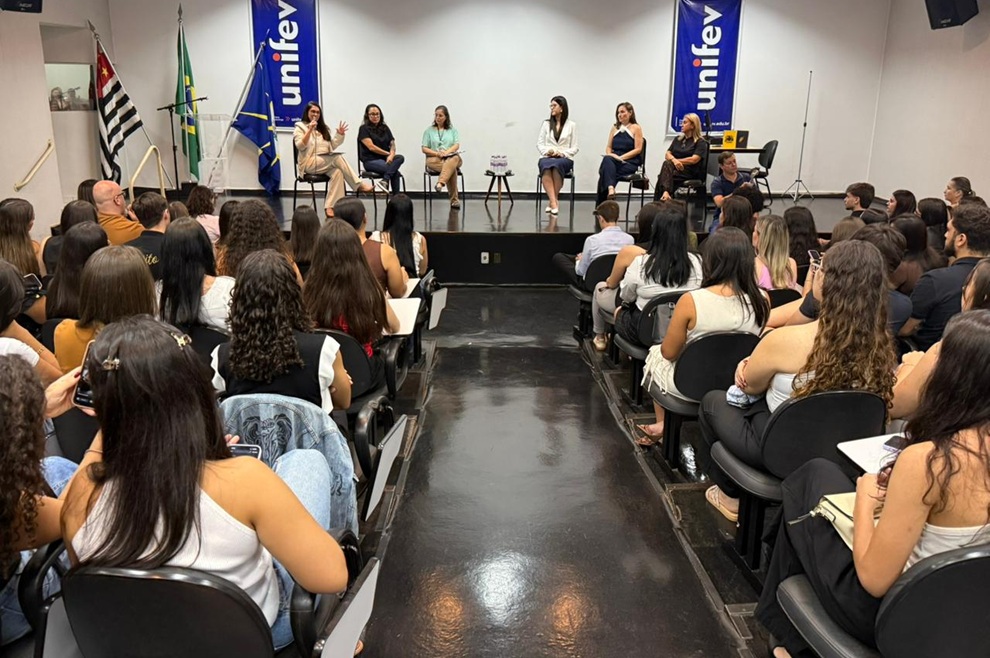 O evento contou as presenças do reitor da Unifev, Prof. Dr. Osvaldo Gastaldon; do pró-reitor acadêmico, Prof. Me. Walter Sampaio Filho e da coordenadora do curso de Direito, Prof. Ma. Ellen Cássia Giacomini Casali. A mediação foi conduzida pela Profa. Ma. Renata Lacerda Borges Scamati, coordenadora do NDH, e contou com a participação de especialistas das áreas jurídica, social e da saúde: Dra. Bruna Marques Libanio, juíza de Direito do Tribunal de Justição de São Paulo; Dra. Ana Lúcia de Biazi Pereira, promotora de Justiça; Dra. Edna Rita de Oliveira, delegada titular da Delegacia de Defesa da Mulher de Votuporanga (DDM); Profa. Ma. Angelica Maria Jabur Bimbato, professora dos cursos de Medicina e Enfermagem da Unifev; e Kelli Regina Kamikawachi, assistente social e coordenadora do Centro de Referência de Atendimento à Mulher (Cram); além dos docentes e alunos da graduação.
