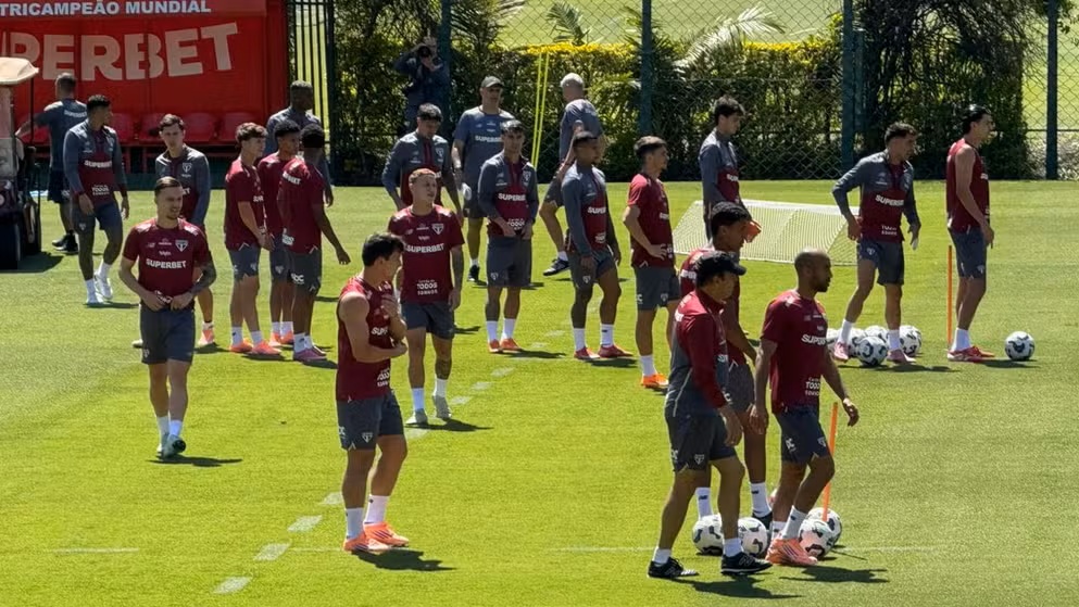 Na sequência, a comissão técnica de Hernán Crespo montou um circuito em que os jogadores trabalharam troca de passes com progressão. Quando a imprensa deixou o CT da Barra Funda, o treinador faria uma atividade com mais cara de jogo, focada na partida do final de semana.