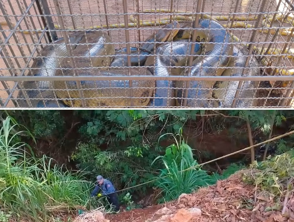 Quando o Corpo de Bombeiros chegou, a sucuri foi localizada em uma cratera perto das residências e não apresentava ferimentos.
