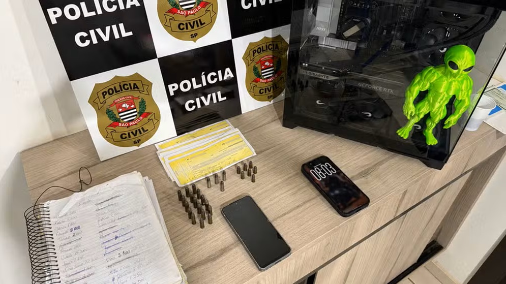 No local, os policiais encontraram 28 munições intactas de calibre .32, além de dois celulares, um computador e documentos como notas promissórias e confissões de dívida.