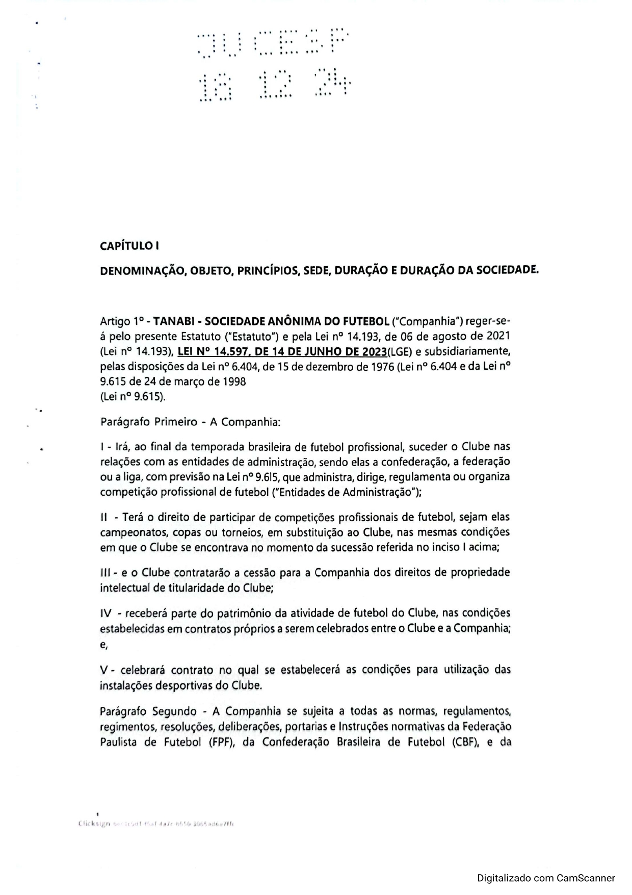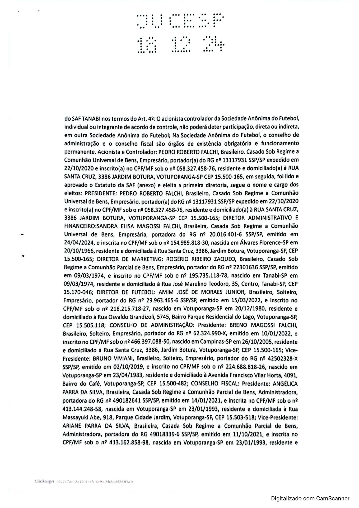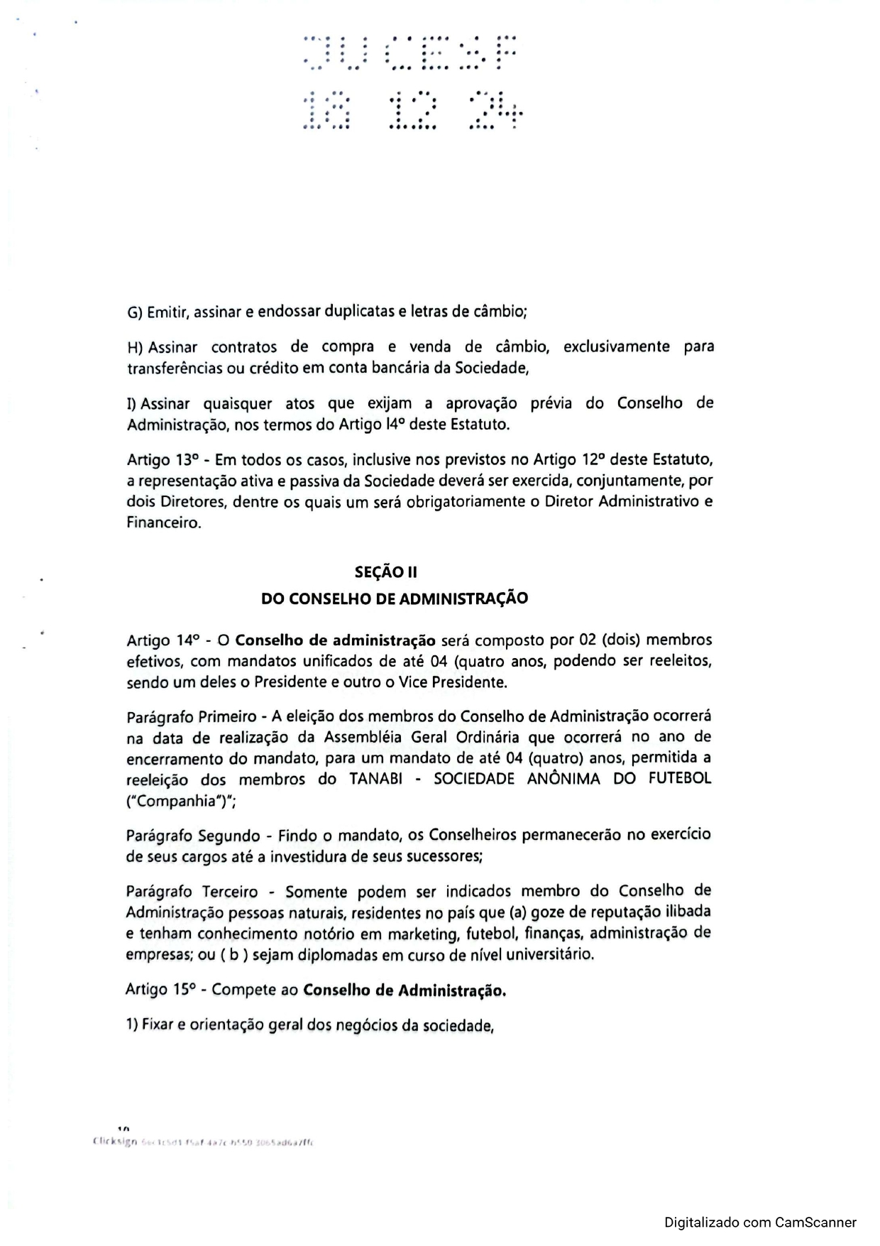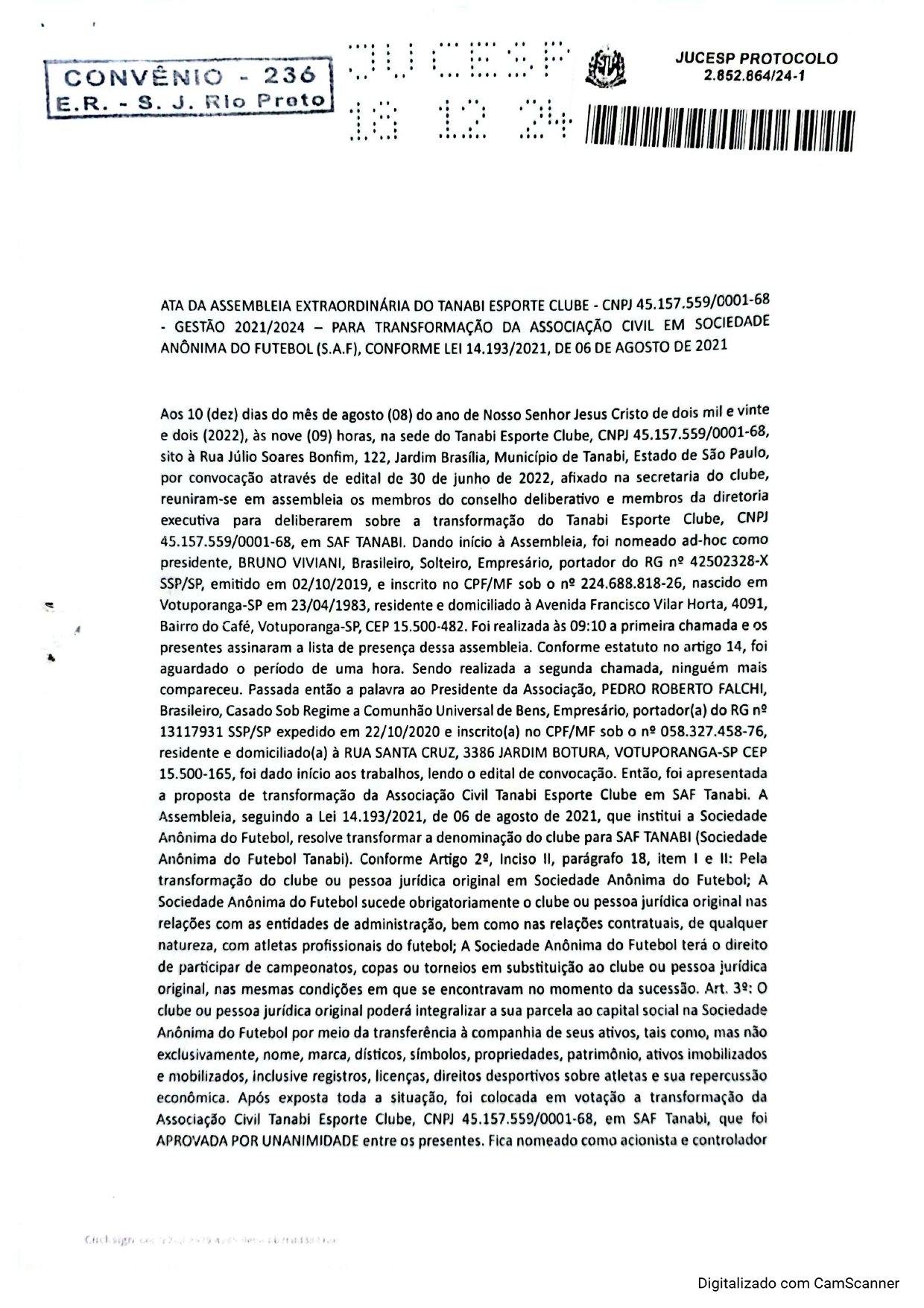 Em Assembleia Geral realizada em 10/08/2022, foi aprovada a transformação do TANABI ESPORTE CLUBE em Sociedade Anônima do Futebol – SAF, nos termos da Lei nº 14.193/2021, bem como a aprovação do Estatuto Social e a eleição da Diretoria, com mandato conforme o Estatuto Social.